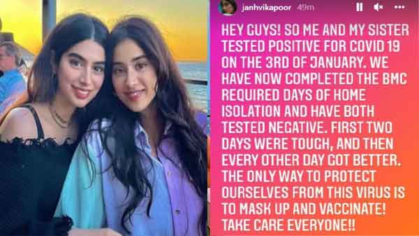 जाह्नवी कपूर ने जो स्टोरी शेयर की है उसमें एक्ट्रेस ने लिखा है कि 3 जनवरी को कोविड मैं और खुशी दोनों कोरोना पॉजिटिव हो गए थे। जिसके बाद बोनी कपूर , जाह्नवी कपूर और खुशी कपूर तीनों सभी घर में क्वांरटीन हो गए। जाह्नवी कपूर ने आगे लिखा कि इस दौरान हमने बीएसी की होम आइसोलेशन की गाइडलाइन्स का पालन किया और अब हम दोनों की रिपोर्ट निगेटिव आ गई है।