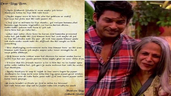 सिद्धार्थ शुक्ला की मां ने लेटर के अंत में लिखा था, ''अब मुझे बेसब्री से फिनाले पर सिड से मिलने का इंतजार है। आप सबका प्यार रहा तो ट्रोफी के साथ के साथ। सिद्धार्थ शुक्ला की मां।''