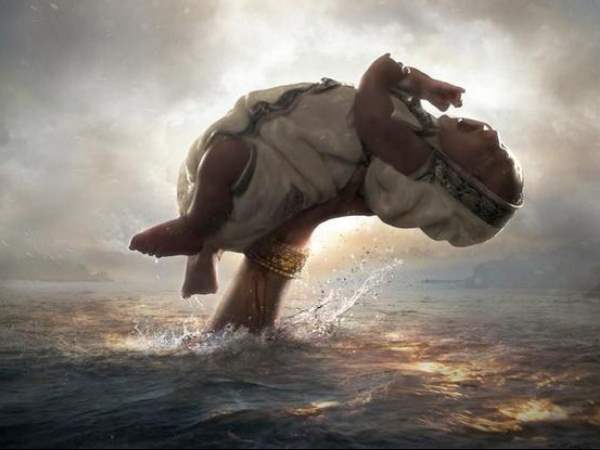 फिल्म के सीन में राजमाता शिवगामी डूब रही होती हैं और उनके हाथ में एक मासूम होता है जो बड़ा होकर महेंद्र बाहुबली बनता है।