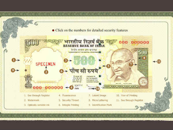 और 500 लिखा होता है जिसे मैग्निफाइयर ग्लास से देखा जा सकता है।