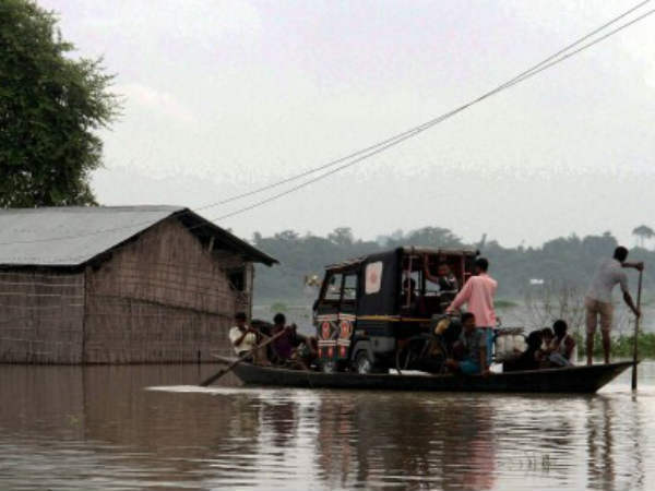 मोरेगांव का बालीमुख गांव पूरी तरह से जलमग्न हो गया है। वहां के लोग एक ऑटो रिक्शा को सुरक्षित स्थान पर ले जाते हुए।
