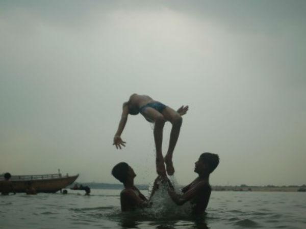 वाराणसी में बहती गंगा नदी में मौज करते बच्चे