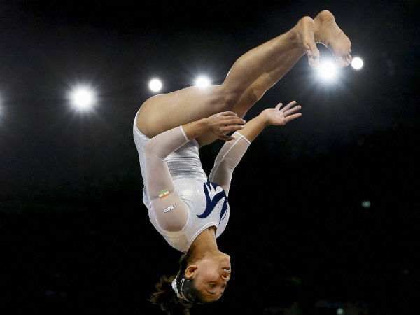 जिमनास्टिक प्रतिस्पर्धा के दौरान भीरत की दीपा करमाकर। इन्होंने कांस्य पदक हासिल किया था।