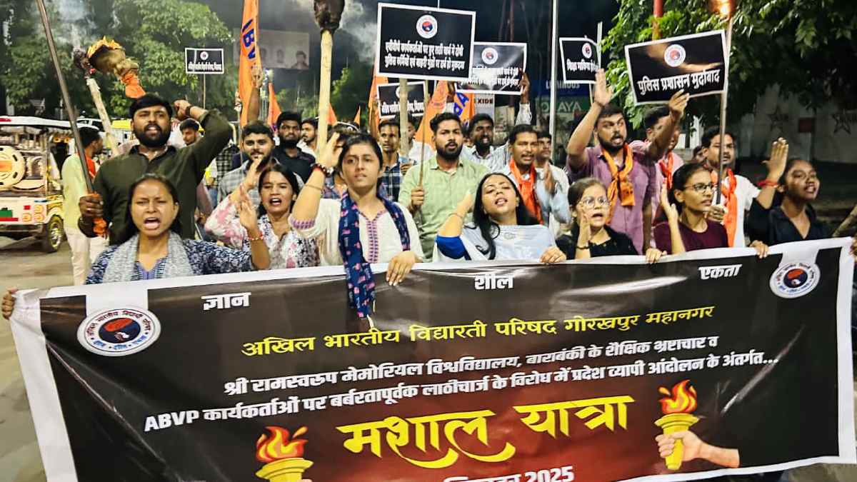 ABVP Gorakhpur Latest News Hindi Uttar Pradesh: अखिल भारतीय विद्यार्थी परिषद, गोरक्ष प्रांत की गोरखपुर महानगर इकाई द्वारा शुक्रवार को मशाल यात्रा निकालकर श्रीराम स्वरूप मेमोरियल विश्वविद्यालय, बाराबंकी में हो रहे शैक्षिक भ्रष्टाचार तथा शांतिपूर्ण आंदोलन कर रहे अभाविप कार्यकर्ताओं पर हुए बर्बर पुलिसिया लाठीचार्ज का जोरदार विरोध किया गया।