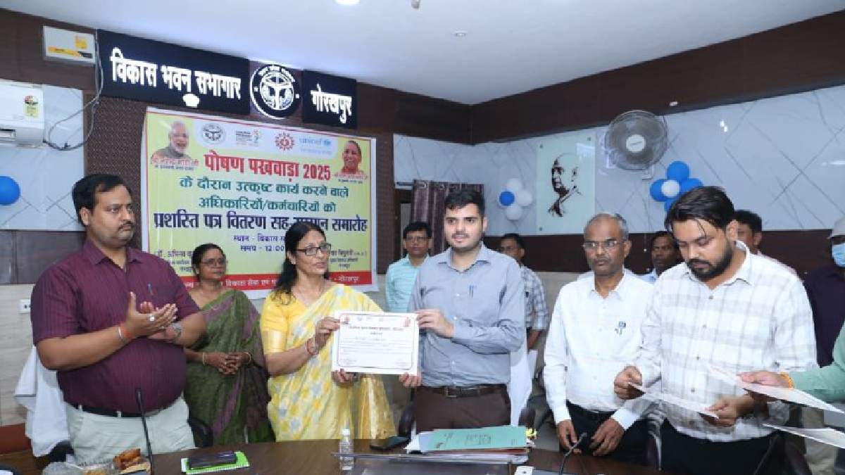 Gorakhpur Latest News Uttar Pradesh: सीएम सिटी गोरखपुर ने बड़ी उपलब्धि हासिल की है। गोरखपुर ने बाल विकास सेवा एवं पुष्टाहार विभाग द्वारा आयोजित पोषण पखवाड़ा 2025 में पूरे प्रदेश में पहला स्थान प्राप्त किया है।मुख्य विकास अधिकारी शाश्वत त्रिपुरारी, जिला कार्यक्रम अधिकारी डॉ अभिनव मिश्रा ने इस पर प्रसन्नता व्यक्त की और कर्मचारियों को प्रशस्ति पत्र भी दिया।