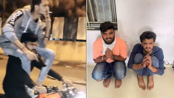 सूरत, 3 जनवरी: गुजरात से एक वीडियो हाल ही में सोशल पर सामने आया था, जिसमें दो युवक एक बुलेट पर स्टंट करते नजर आ रहे थे। इसमें से एक के हाथ में पिस्टर भी नजर आ रहा था। वीडियो वायरल होने के बाद पुलिस ने दोनों युवकों को गिरफ्तार कर लिया है। गिरफ्तारी के बाद थाने से दोनों की तस्वीर सामने आई है, जिसमें ये हाथ जोड़े बैठे हुए नजर आ रहे हैं।