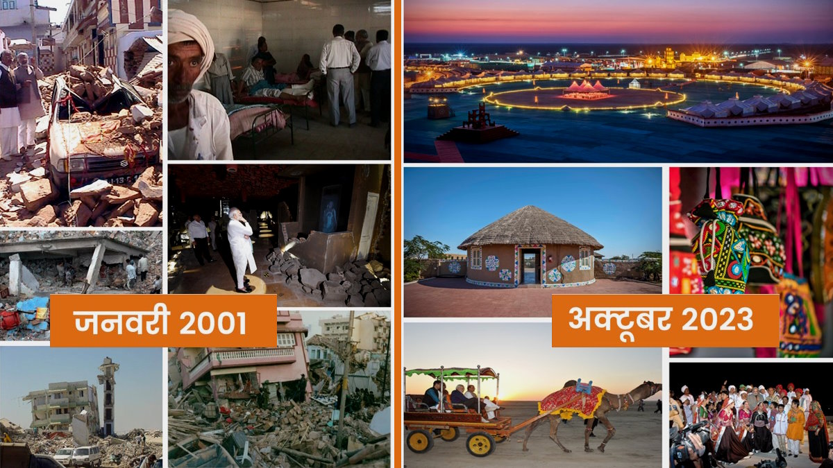 Dhordo Success Story & Kutch Rann Utsav 2023: खबर में एक तस्वीर जनवरी 2001 की और दूसरी तस्वीर अक्टूबर 2023 की है। जगह गांव धोरडो कच्छ गुजरात है। 22 साल पहले की पहली फोटो में तबाही है। हर तरफ खौफनाक मंजर है जबकि अब उसी जगह पर उत्सव है। साकार होती गुजरात की लोक संस्कृति है। देसी-विदेशी पावणे भी नजर आ रहे हैं।