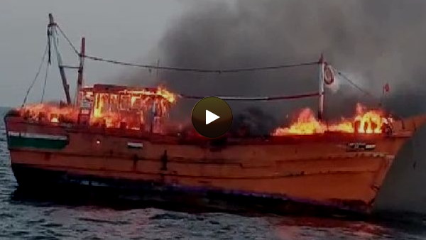 VIDEO: मछली पकड़ते समय समुद्र में आग का गोला बनी बोट, दूसरी नाव वाले मछुआरों ने बचाई 7 की जान