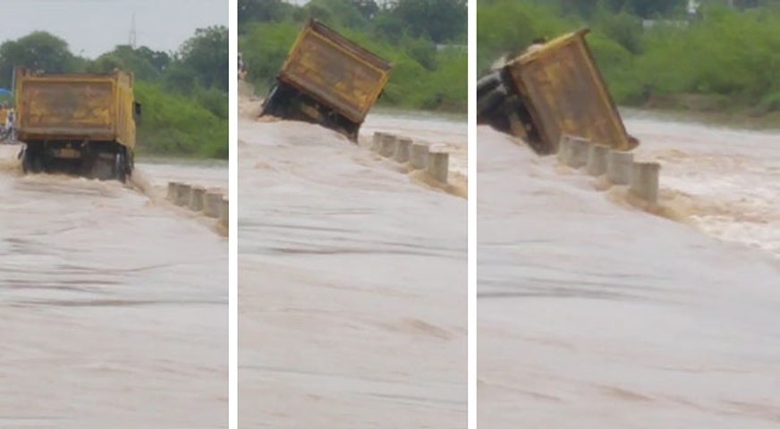 यहां पानी में डूबी रोड से एक डम्पर (ट्रक/ट्रोला) गुजर रहा था। उसके ड्राइवर को लगा था कि वो आसानी से उसमें से डम्पर को पार कर लेगा। अन्य लोग उसका वीडियो बनाने लगे। फिर जैसे ही डम्पर आधे रास्ते तक पहुंचा, पानी के तेज बहाव में वह धचाक से पलट गया। उसे पानी में डूबा देखकर अन्य लोग उस तरफ दौड़े। काफी जद्दोजहद के बाद उसमें सवार चार लोगों को सुरक्षित रूप से बाहर निकाला गया।