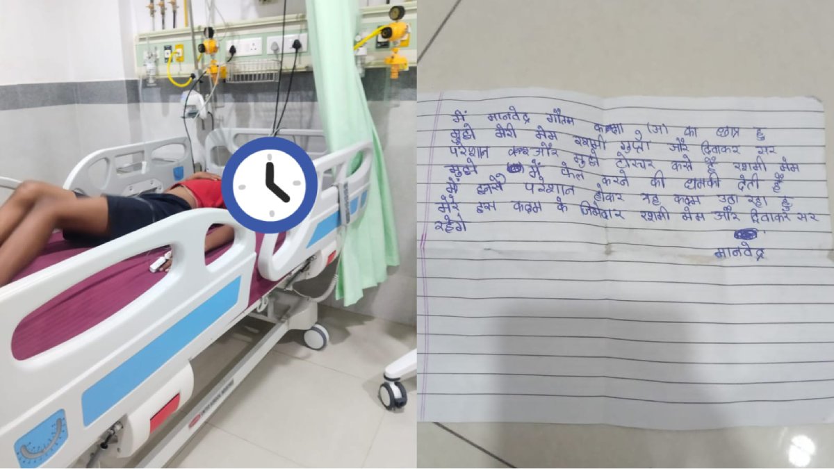 इतना ही नहीं, सुसाइड नोट में उसने स्कूल शिक्षक पर परेशान करने का आरोप लगाया है। ग्वालियर के केंद्रीय विद्यालय नंबर 2 में पढ़ने वाले कक्षा 9 के छात्र मानवेंद्र की हालत गंभीर बनी हुई है।