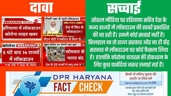 राज्य सरकार की फैक्ट चेकिंग टीम ने ट्वीट किया, "सोशल मीडिया पर हरियाणा सहित कई राज्यों में लॉकडाउन की खबरें चलाई जा रही हैं। इनमें कोई सच्चाई नहीं है। फिलहाल ना तो हरियाणा सरकार और ना ही केंद्र सरकार ने लॉकडाउन पर कोई फैसला लिया है। हालांकि, कोरोना वायरस के संक्रमण की रोकथाम के लिए कुछ पाबंदियां जरूर लगाई गई हैं।