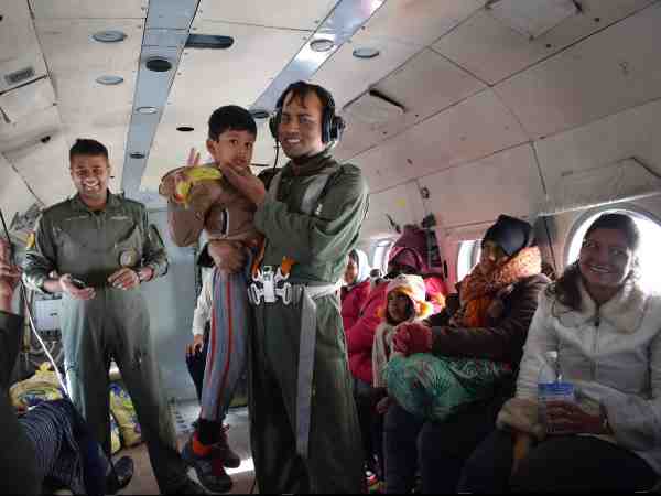 हेलीकॉप्टर से फंसे लोगों को खाने के पैकेट गिराने के बाद वहां लगभग छह दिन से फंसे लोग की जान में जान आ गई। हेलीकॉप्टर को हवा में रोककर वायु सेना के जांबाजों ने दस महिलाओं और तीन बच्चों को एयरलिफ्ट किया।