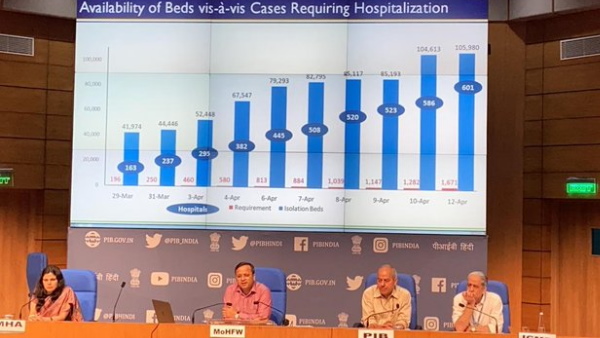 लव अग्रवाल ने कहा, 29 मार्च तक हमारे पास 979 सकारात्मक मामले थे अब यह बढ़कर देशभर में कुल 8356 मामले हो चुके हैं। इनमें से 20% मामलों को ICU सपोर्ट की आवश्यकता है वहीं, दूसरी ओर 1671 रोगियों को ऑक्सीजन सहायता और महत्वपूर्ण देखभाल उपचार की आवश्यकता है। यह आंकड़ा इसलिए जरूरी है ताकि पता चल सके कि सरकार तैयार होने में चीजों की योजना बना रही है। उन्होंने आगे कहा, 9 अप्रैल के आंकड़ों के अनुसार, अगर हमें 1,100 बेड की आवश्यकता थी, तो हमारे पास 85,000 बेड थे। आज जब हमें 1,671 बेड की आवश्यकता है, तब हमारे पास 601 कोविड समर्पित अस्पतालों में 1 लाख 5 हजार बेड हैं।
