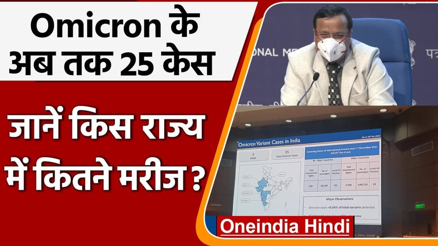 केन्द्रीय स्वास्थ्य मंत्रालय की ओर से लख अग्रवाल ने शुक्रवार को प्रेस कान्फ्रेंस में बताया कि देश में अब तक कुल 25 ओमाइक्रोन मामले सामने आ चुके हैं। जिन लोगों में आमिक्रॉन की पॉजिटिव की रिपोर्ट आई है उन सभी कोरोनाक के बहुत हल्के लक्षण हैं। कुल प्रकारों में से 0.04% से कम का पता चला है।