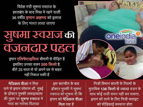 500 किलोग्राम वजन की इमान अहमद को कायरो स्थित अपने घर से बाहर निकले ही करीब 25 साल हो गए हैं। वो मेडिकल ट्रीटमेंट के लिए भारत आना चाहती हैं, लेकिन ये किसी चुनौती से कम नहीं लग रहा।