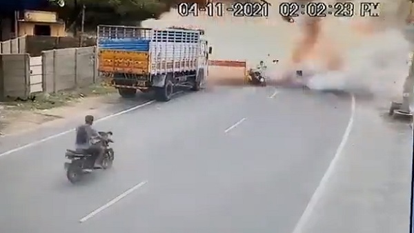 स्कूटी पर पटाखों से भरे बोरे में हुआ विस्फोट, हादसे में बाप-बेटे की की दर्दनाक मौत, देखें वीडियो