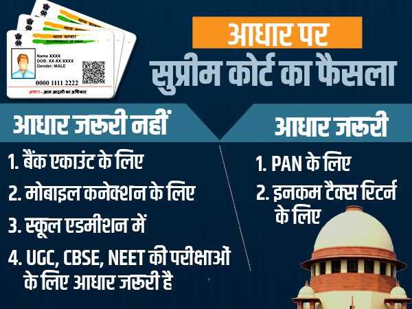 1:- सुप्रीम कोर्ट ने कहा, 'आधार कार्ड पूरी तरह वैध है। आधार देश के गरीबों की ताकत का जरिया बना है। इसमें डुप्लीकेसी की आशंका नहीं है इसलिए इसे खारिज करने की जरूरत नहीं। आधार का होना आपको अलग बनाता है।'