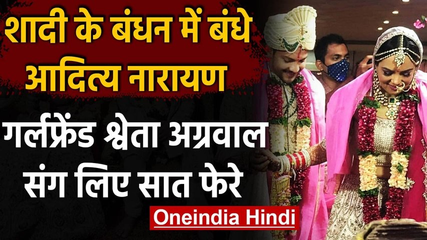 Aditya Narayan-Shweta Agarwal's wedding Pics: मशहूर गायक उदित नारायण के सिंगर बेटे और 'इंडियन आइडियल' होस्ट आदित्य नारायण ने अपने जीवन का नया अध्याय शुूरू कर दिया है। 1 दिंसबर को उन्होंने अपनी 10 साल पुरानी गर्लफ्रेंड श्वेता अग्रवाल संग सात फेरे ले लिए। कोरोना वायरस गाइडलाइन के हिसाब से इस शादी में काफी कम लोग शामिल हुए। आदित्य और श्वेता की शादी की तस्वीरें इस वक्त सोशल मीडिया पर आकर्षण का केंद्र बनी हुई हैं। दोनों तस्वीरों में बहुत ज्यादा सुंदर और खुश नजर आ रहे हैं।