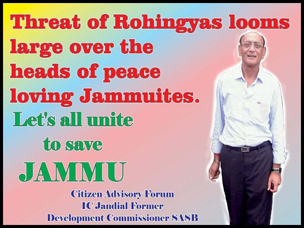 इसी मसले पर 1 मार्च को प्रकाशित कराए गए विज्ञापन में सिटिजन एडवाइजरी फोरम, आईसी जिंदल की फोटो के साथ लिखा है- 'जम्मू पर रोहिंग्याओं को खतरा है। आइए जम्मू को बचाएं।' 2 मार्च को प्रकाशित कराए गए विज्ञापन में जम्मू चैंबर ऑफ कॉमर्स के सचिव गौरव गुप्ता की तस्वीर के साथ लिखा गया है कि- ' जम्मूवासियों पर रोहिंग्याओं का खतरा है। आइए इसे बचाएं। ' वहीं 4 मार्च को प्रकाशित कराए गए विज्ञापन में टीम जम्मू के चेयरमैन जोरावर सिंह की तस्वीर के साथ लिखा गया है कि- 'जम्मू को बचाने के लिए सभी एकजुट हो जाएं।'