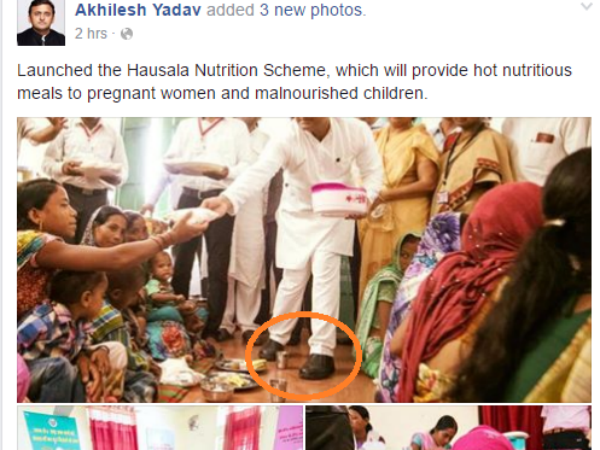 सोशल मीडिया पर सीएम अखिलेश के पेज पर शेयर की गई फोटोज में साफ तौर पर देखा जा सकता है कि वे जूते पहनकर लोगों को खाना बाँट रहे हैं। जबकि उनके जूते लोगों के खाने के पास हैं। जिस पर सपा सरकार की हौसला योजना पर चुटकी लेना शुरू कर दिया गया।