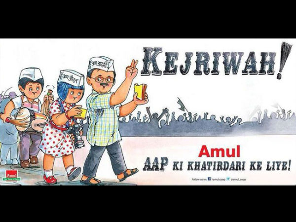 वहीं सामयिक और व्यंग्य से लबरेज ऐड के लिए मशहूर डेयरी ब्रांड अमूल ने भी अरविंद केजरीवाल को टारगेट किया है। जी हां अमूल के ऐड में अरविंद केजरीवाल पर केंद्रित है और ऐड का टाइटल रखा गया है ‘केजरीवाह, साथ ही पार्टी का चुनाव निशान झाड़ू को भी दर्शाया गया है। ऐड में केजरीवाल के जनलोकपाल बिल पर चले आंदोलन को ध्यान में रख कर कंपनी ने बैकग्राउंड स्केच बनाया है।