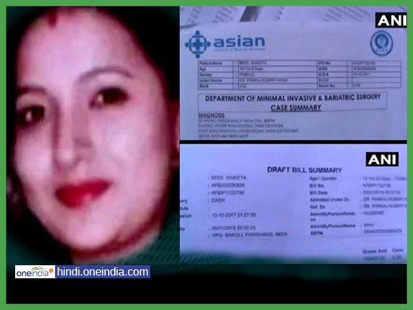 जानकारी के मुताबिक श्वेता को 13 दिसंबर को एशियन हॉस्पिटल में एडमिट करवाया गया था। वो 7 माह की गर्भवती थी। इलाज के 3-4 दिन बताया गया कि गर्भ में शिशु मर चुका है और ऑपरेशन करने से पहले साढ़े तीन लाख रुपये जमा करवाने होंगे। परिजनों ने पैसों का इंतजाम किया और जब तक पैसे जमा नहीं किए गए, ऑपरेशन शुरू नहीं किया गया।