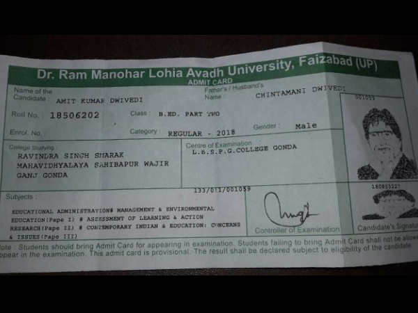 फैजाबाद। डॉ राम मनोहर लोहिया अवध विश्वविद्यालय फैजाबाद ने अपने अजीबो-गरीब कारनामें से एक बार फिर चौंका दिया है। विश्वविद्यालय ने एक ऐसा एडमिट कार्ड जारी कर दिया है जिसमें छात्र की तस्वीर के जगह बिग बी अमिताभ बच्चन की फोटो लगी है। छात्र की परीक्षा न छूटे इसके लिए संबंधित महाविद्यालय ने एक पत्र जारी कर परीक्षा केंद्र को भेजा, जिसके बाद वह बीएड द्वितीय वर्ष की वार्षिक परीक्षा में शामिल हो सका।