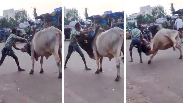 बीच सड़क 'भल्लालदेव' बना ये शख्स, भारी भरकम सांड को पटका, देखिए Video