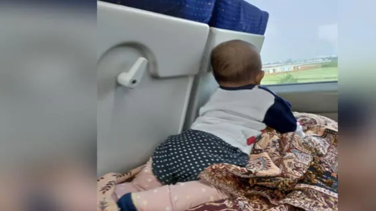 दरअसल, ये ट्रेन के डिब्बे के अंदर की फोटो है जिसमें बच्चा सीट के सामने लगी ट्रे में मजे से लेटा हुए ट्रेन के बाहर का खूबसूरत नजारा लेते हुए यात्रा का मजा ले रहा है।