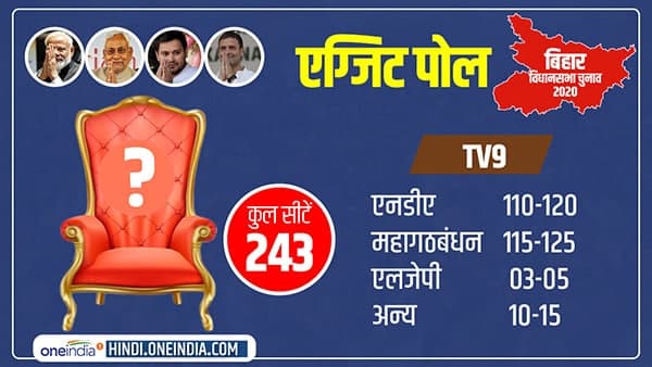 TV9 के एग्जिट पोल के मुताबिक बिहार विधानसभा चुनाव में एनडीए को 110 से 120 सीटें मिल सकती हैं, जबकि महागठबंधन को 115 से 125 सीटें मिलने का अनुमान है। वहीं लोजपा को 3-5 और अन्य के खाते में 10-15 सीटें जा सकती हैं। अगर ये एग्जिट पोल सही हुआ तो नीतीश कुमार की 15 साल पुरानी सत्ता चली जाएगी, क्योंकि बहुमत के लिए सिर्फ 122 सीटों की ही जरूरत है।
