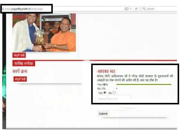 देश में मुसलमानों की बढ़ती आबादी को लेकर आदित्यनाथ की वेबसाइट पर एक पोल डाला गया है जिसमें पूछा गया है कि सांसद योगी आदित्यनाथ जी ने नरेंद्र मोदी सरकार से मुसलमानों की आबादी पर रोक लगाने की अपील की है, क्या यह सही है।