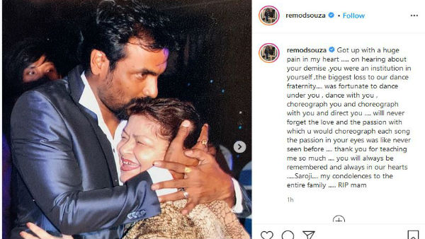 कोरियोग्राफर और निर्देशक रेमो डिसूजा सरोज खान के निधन से बेहद भावुक हो गए। उन्होंने इंस्टाग्राम पर इसका दर्ज बयां किया। डेमो ने लिखा कि मैं बहुत खुशनसीब हूं कि मुझे आपके साथ डांस करने का मौका मिला। मुझे सिखाने के लिए आपको दिल से शुक्रिया। आप हमेशा हमारे दिल में रहेंगी।