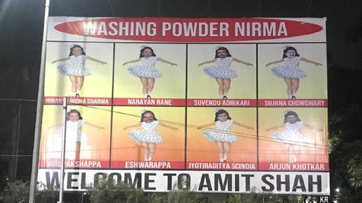वॉशिंग पाउडर निरमा का टीवी विज्ञापन आपने जरूर देखा हो जोकि काफी लोकप्रिय हुआ था। विज्ञापन में गंदे कपड़े निरमा में डालने पर वह पूरी तरह से साफ होकर निकलता था। इस विज्ञापन की ही तर्ज पर भारत राष्ट्र समिति ने हैदराबाद में अमित शाह पर तंज कसते हुए पोस्टर लगवाए हैं। इन पोस्टर में उन नेताओं के नाम छापे गए हैं जो पहले दूसरे दल में थे और अब वह भाजपा में हैं। पोस्टर के जरिए अमित शाह पर निशाना साधा गया है कि भाजपा में आने के बाद नेता पूरी तरह से साफ हो जाते हैं उनपर सारे आरोप खत्म हो जाते हैं। बता दें कि अमित शाह सीआईएसएफ की 54वें डे परेड में हिस्सा लेने के लिए पहुंचे हैं।