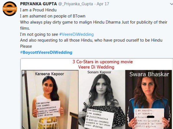 कुछ लोगों ने लिखा है कि हमें अपने हिंदू होने पर गर्व है, मुझे बॉलीवुड की हस्तियों पर शर्म आती है, जो हमेशा गंदे गेम्स खेलते हैं। मैं 'वीरे दी वेडिंग' देखने नहीं जाऊंगी। पूरी तरह से बायकॉट करूंगी।