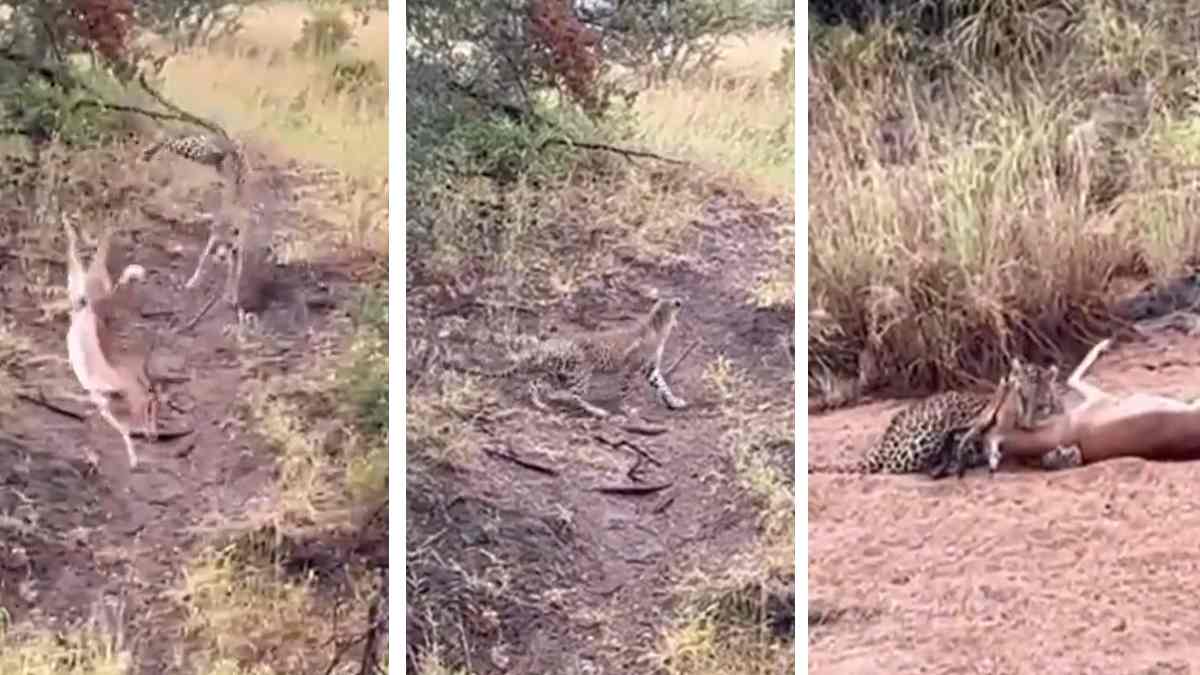 वहीं जब हिरण चीते के एकदम पास पहुंच गया तो उसकी नजर पड़ी। उसने बचने के लिए लंबी छलांग मारी। ऐसे में चीता भी एकदम निंजा फाइटर की तरह उछला और आगे जाकर हिरण को धर दबोचा।