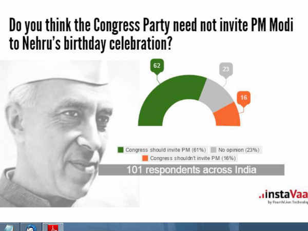 कर्नाटक, महाराष्ट्र, तमिलनाडु और पश्चिम बंगाल में 14 नवंबर यानी नेहरु के जन्मदिवस के मौके पर एक सर्वे कराया गया था। इस सर्वे का मकसद इस मुद्दे पर जनता की राय हासिल करना था। सर्वे में शामिल 101 लोगों में से 61 प्रतिशत लोग ऐसे थे जिन्होंने माना कि इस समारोह के लिए मोदी को भी न्यौता भेजा जाना चाहिए।