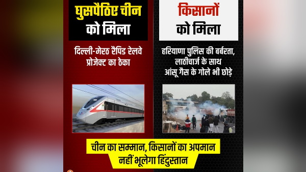 कांग्रेस ने ट्वीट के साथ एक ग्रफिक्स शेयर किया जिसमें एक तरफ दिल्ली-मेरठ रैपिड रेलवे प्रोजेक्ट की तस्वीर है तो दूसरी तरफ हरियाणा में आंदोलनकारी किसानों पर पुलिस लाठीचार्ज की तस्वीर। इस ट्वीट में कांग्रेस ने लिखा कि, घुसपैठिए चीन को मिला दिल्ली-मेरठ रैपिड रेलवे प्रोजेक्ट का ठेका। किसानों को मिला- हरियाणा पुलिस की बर्बरता, लाठीचार्ज के साथ आंसू गैस के गोले भी छोड़े। चीन का सम्मान, किसानों का अपमान, नहीं भूलेगा हिंदुस्तान।