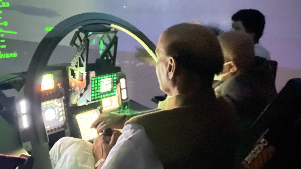 ट्विटर पर राजनाथ सिंह ने एक फोटो शेयर की है, जिसमें वो सिम्युलेटर में बैठे हैं। वहां सामने की स्क्रीन तेजस के HUD, हेड-अप डिस्प्ले से जगमगा रही थी, जिसमें उड़ान की ऊंचाई और अन्य डेटा दिखाया गया। उनके बगल एक प्रशिक्षित पायलट बैठा था, जिन्होंने विमान के नियंत्रण को संभाला। फोटो के साथ रक्षामंत्री ने लिखा कि बेंगलुरू में वैमानिकी विकास प्रतिष्ठान (एडीई) सुविधा में एलसीए तेजस सिम्युलेटर में उड़ान भरने का अनुभव अद्भुत था।