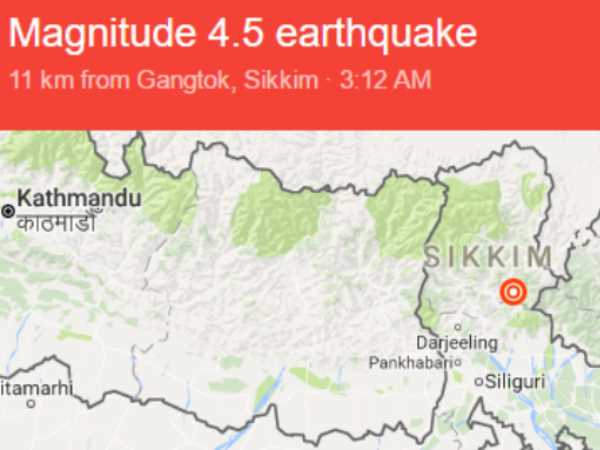 तड़के लगभग 3 बजे जब सभी लोग सो रहे थे तभी सिक्किम में भूंकप आया। रिक्टर स्केल पर इस भूकंप की तीव्रता 4.5 मापी गई है।