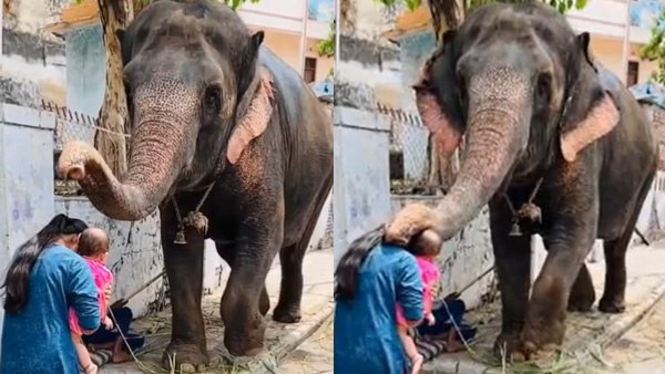 वीडियो में देखा जा रहा है कि एक महिला बच्चे को गोद में लेकर हाथी के सामने खड़ी हो जाती है। जब वे अपना सिर झुकाते हैं, तो गजानन उन्हें आशीर्वाद देने के लिए अपनी सूंड उसके सिर पर रखता है।