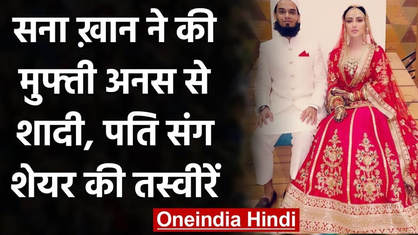 सना खान ने जो फोटो शेयर कि है उसमें वह लाल रंग का ब्राइडल लहंगा पहने हुए हैं जबकि उनके शौहर मुफ्ती अनस सफेद ड्रेस में नजर आ रहे हैं।