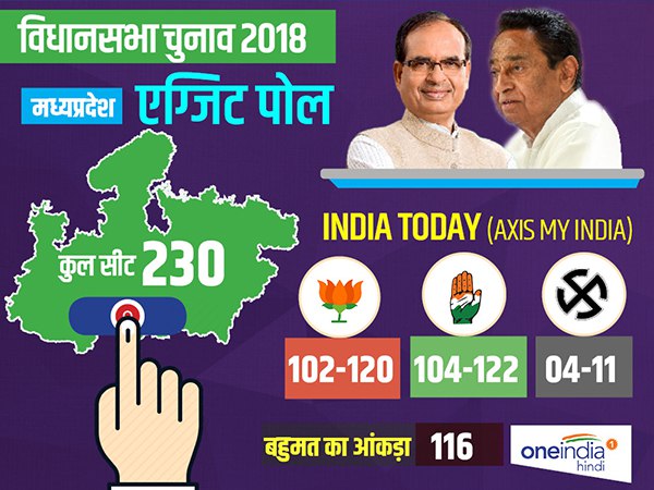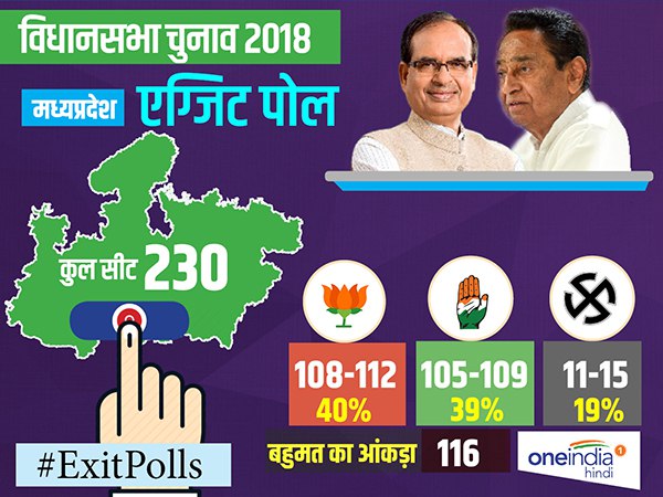 न्यूज नेशन के एग्जिट पोल में मध्य प्रदेश में कांग्रेस और भाजपा के बीच मुकाबला नजदीकी है। यहां 230 सीटों में से बीजेपी को 108 से 112 सीटें और कांग्रेस को 105 से 109 सीटें मिल रही हैं। अन्य को 11 से 15 सीटें मिल रही हैं। वोट प्रतिशत की बात की जाए तो कांग्रेस-39 प्रतिशत वोट, बीजेपी-40 प्रतिशत वोट और अन्य को 14 प्रतिश वोट मिल रहे हैँ।