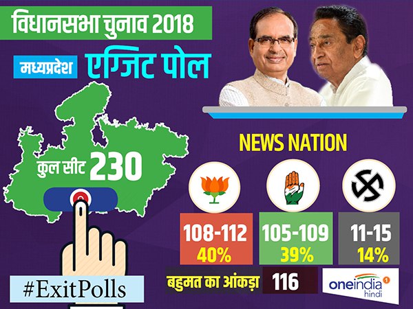 न्यूज नेशन के एग्जिट पोल में मध्य प्रदेश में कांग्रेस और भाजपा के बीच मुकाबला नजदीकी है। यहां 230 सीटों में से बीजेपी को 108 से 112 सीटें और कांग्रेस को 105 से 109 सीटें मिल रही हैं। अन्य को 11 से 15 सीटें मिल रही हैं। वोट प्रतिशत की बात की जाए तो कांग्रेस-39 प्रतिशत वोट, बीजेपी-40 प्रतिशत वोट और अन्य को 14 प्रतिश वोट मिल रहे हैं।