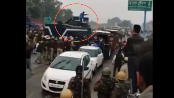 सोशल मीडिया पर किसान विरोधप्रदर्शन का एक वीडियो वायरल हुआ है जिसमें देखा जा सकता है कि सड़क पर हजारों की संख्या में किसान और सुरक्षाबल एक-दूसरे के सामने हैं। इस बीच किसानों को आगे आने से रोकने के लिए पुलिस ने वाटर कैनन का इस्तेमाल किया। तभी एक युवा प्रदर्शनकारी ट्रक पर चढ़कर वाटर कैनन को बंद कर दिया। उसे पकड़ने के लिए एक पुलिसकर्मी भी पीछे से चढ़ता है, लेकिन इससे पहले की वह प्रदर्शनकारी को पकड़ पाए युवक दूसरी तरफ छलांग लगाकर नीचे कूद जाता है।