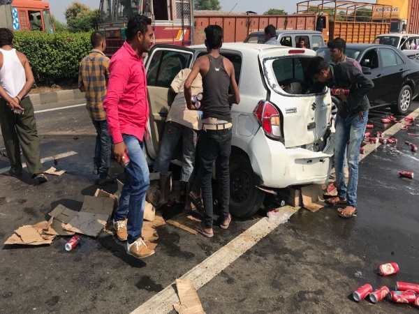 एक्सीडेंट होते ही सारे कार्टन्स फट गए। उनमें रखीं बियर की कैन्स सड़क पर बिखर गईं। वडोदरा के दुमाद के पास हुए इस हादसे की खबर जब आस पास के लोगों को हुई तो वहां मची लूट का नजारा देखने लायक था। लोग देखते ही देखते कार पर टूट पड़े और बियर लूट लीं।