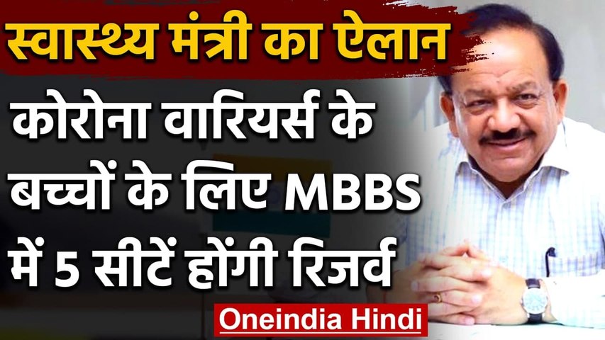 केंद्रीय स्वास्थ्य मंत्री डॉ हर्षवर्धन ने आगे कहा, 'शैक्षणिक वर्ष 2020-21 के लिए कोरोना योद्धाओं के बच्चों के लिए एमबीबीएस में सीटें आरक्षित की गई हैं।' डॉ हर्षवर्धन ने यह भी बताया कि इस श्रेणी में कौन लोग हैं जो कोविड-19 वारियर्स के दायरे में आएंगे। उन्होंने बताया कि कोरोना वॉरियर वो हैं जो अस्पतालों में नर्स और डॉक्टर के तौर पर काम कर रहे हैं साथ ही इस श्रेणी में जमीन पर काम करने वाले आशा वर्कर्स को भी शामिल किया गया है। इन कोरोना योद्धाओं के बच्चों के लिए राष्ट्रीय कोटा में 5 सीट रिजर्व की गई हैं।