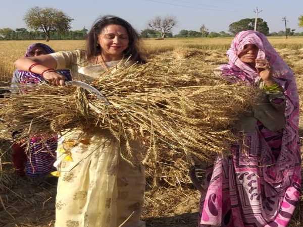 हेमा मालिनी का प्रचार का अनोखा तरीका, खेतों में महिलाओं के साथ मिलकर काटी फसल