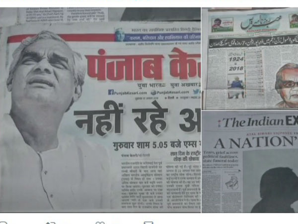 पंजाब केसरी ने पहले पेज पर अटल जी की तस्वीर को छापते हुए लिखा है नहीं रहे अटल, गुरुवार शाम 5.05 बजे एम्स में ली अंतिम सांस। वहीं उर्दू अखबार राजोनामा खबरें में भी अटल जी के निधन की खबर को मुख्य पेज पर जगह दी गई है। साथ ही उनके जीवन परिचय को संक्षिप्त में पहले पेज पर छापा गया है। अंग्रेजी के राष्ट्रीय अखबार द इंडियन एक्सप्रेस ने भारत की क्षति शीर्षक से अटल जी के निधन की खबर को पहले पेज पर जगह दी है। साथ ही अटल जी की तस्वीर की छवि जिसमे वह भाषण दे रहे हैं को छापा गया है।