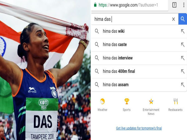 हिमा दास के गोल्ड जीतने के बाद गूगल में उनके बारे में लोग सर्च करने लगे। हिमा के जीतने के बाद गूगल सर्च में उन्हें और खासकर उनकी जाति को लेकर काफी उछाल आया। गूगल ट्रेंड में सबसे ज्यादा बार लोगों ने हिमा दास की जाति सर्च की। खास बात ये हैं कि हिमा की जाति चलाशने वालों में सबसे ज्यादा संख्या असम के लोगों की है। दूसरे नंबर पर अरुणाचल प्रदेश के लोग हैं।