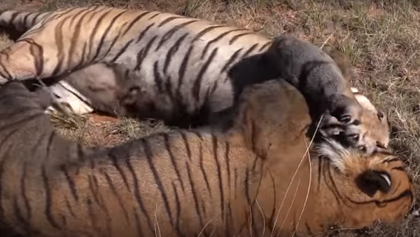 तीन मिनट के इस वीडियो में दो बाघ आपस में लड़ते हैं, जबकि बाघिन चुपचाप पास खड़ी होकर देखती रहती है। शुरू में एक बाघ ने दूसरी की गर्दन दबा दी, ऐसे में लगा कि वो मर जाएगा, लेकिन वो फिर से खड़ा होता है और लड़ाई शुरू कर देता है। खास बात ये है कि बीच-बीच में दोनों बाघ रुककर आराम भी करते हैं। वहीं लड़ाई में कौन जीतता है और कौन हारता है, ये वीडियो में नहीं दिखाया गया है। फिलहाल लोग इस वीडियो को खूब पसंद कर रहे हैं।